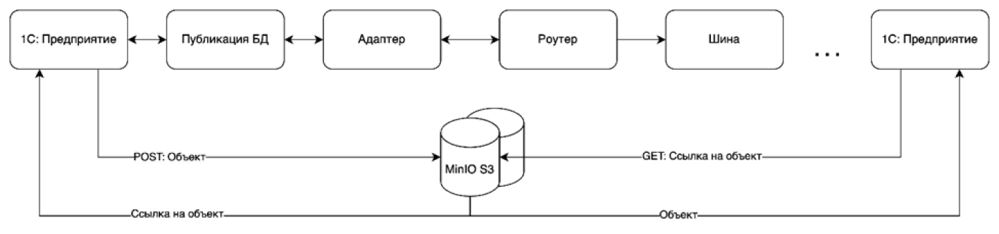 Пример использования шины для передачи больших файлов: файл сначала загружается в объектное хранилище (MinIO или S3), после чего получатель получает ссылку на этот файл через сообщение в брокере.